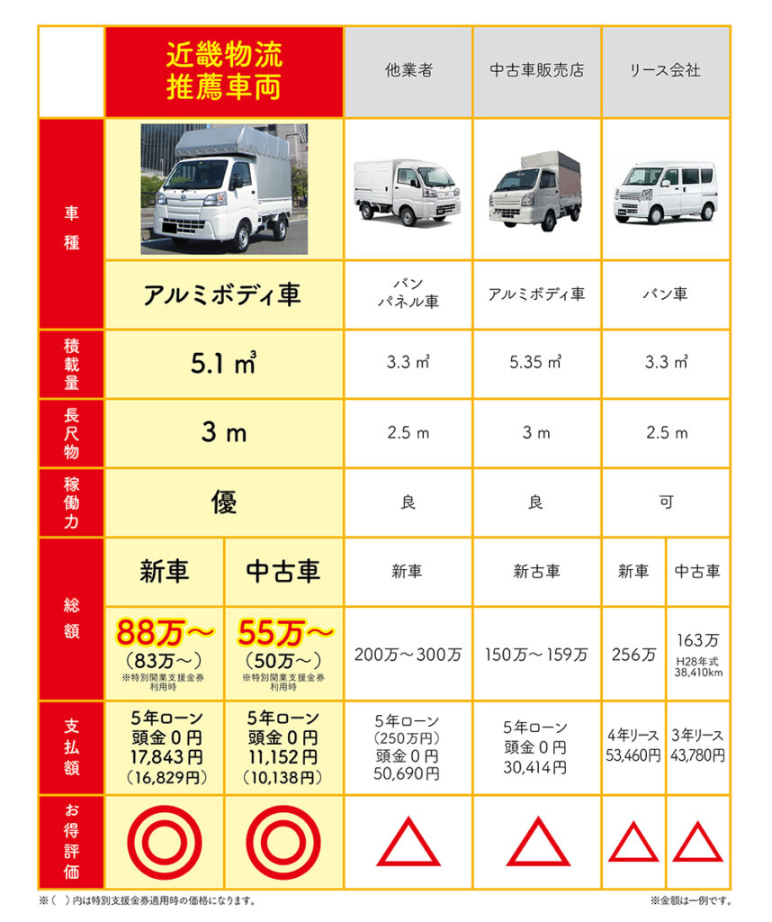 | 開業支援 | 弊社推薦業者にて指定幌高アルミボディ車輌を購入の場合 開業支援制度として80万円を当社が負担します。 | |